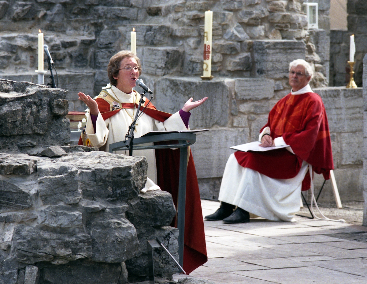 Apning Av Vernebygget Over Ruinen Pa Domkirkeodden 9 August 1998 Biskop Rosemarie Kohn Holder Preken Domprost Ole Elias Holck Sitter I Bakgrunn Anno Domkirkeodden Digitaltmuseum